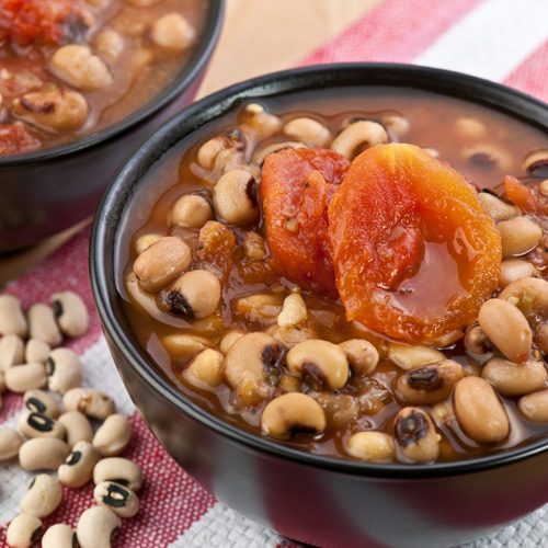 Place the black-eyed peas into a large container and cover with several inches of cool water; let soak, 8 hours to overnight. Drain and rinse before using. Heat oil in a large stockpot over medium heat. Add onion and garlic; cook and stir until onion becomes translucent, about 5 minutes. Pour in 8 cups of water and chicken broth; bring to a boil, then reduce heat to a simmer. Stir in soaked black-eyed peas, ham hocks, tomatoes, pepperoncini, bay leaf, garlic powder, thyme, salt, and pepper. Cover and simmer until peas are tender, ham meat is falling off the bones, and the broth is thickened, about 3 hours.